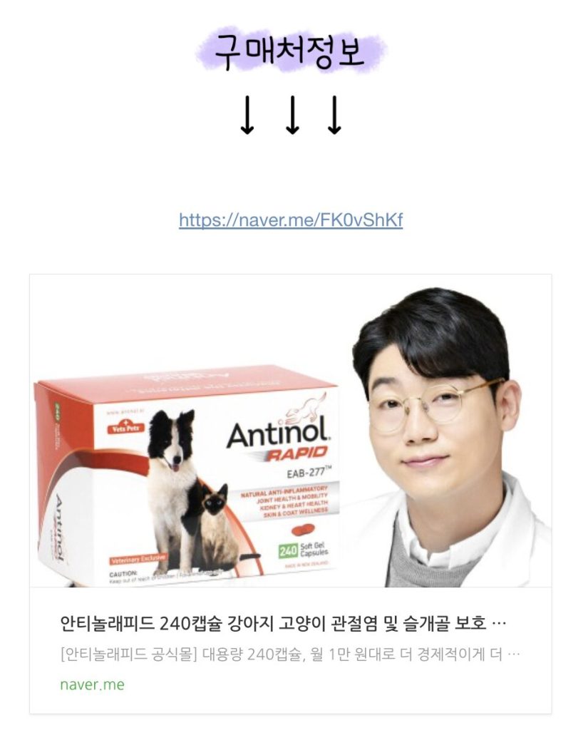 산책 모임에서 만난 지인들한테 물어보니 두 집 모두 관절 영양제 안티놀 래피드를 추천하더라고요. 어떤 제품인지 궁금해서 바로 알아봤어요.
