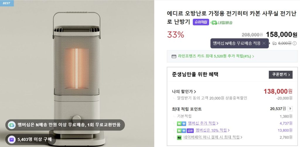 현재 네이버 슈퍼적립 기간이여서 네이버 멤버십이라면 10% 추가 적립됩니다. 알림받기 동의 고객을 대상으로2만원 상품중복할인 쿠폰까지 적용되는 경우가 많으니, 실제 결제 금액은 상세페이지에서 한 번 확인해 보세요.