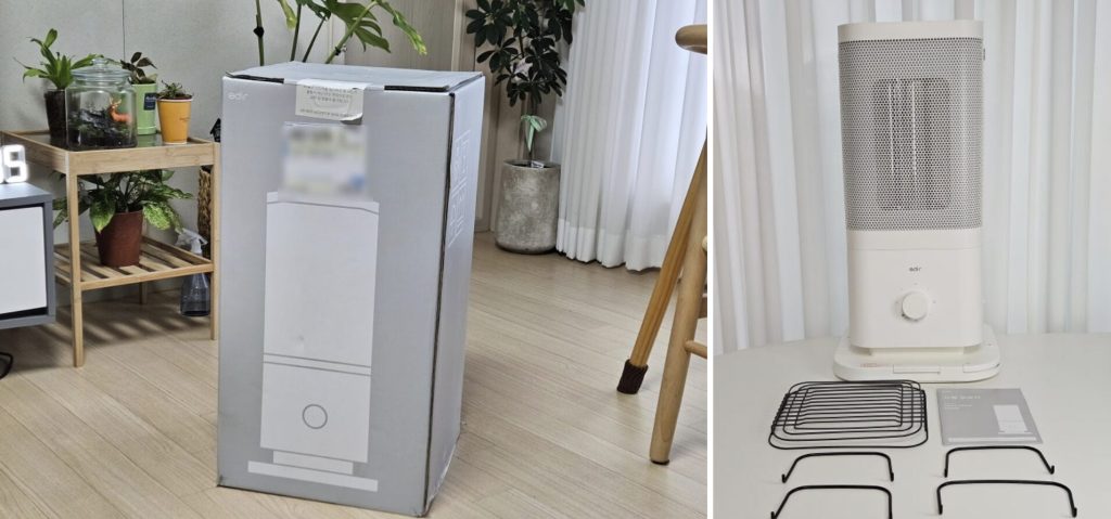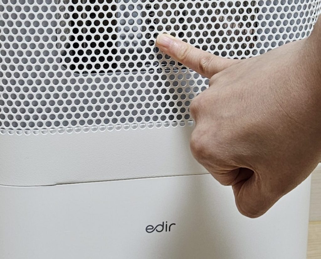 외관은 아이가 손을 대기 쉬운 상단과 측면에 보호망이 둘러져 있어 직접 발열체를 만지기 어렵게 되어 있습니다. 물론 뜨거운 공기가 나오는 제품 특성상 아기·반려동물 있는 집에서는 어느 난방기든 거리 유지가 필수죠.