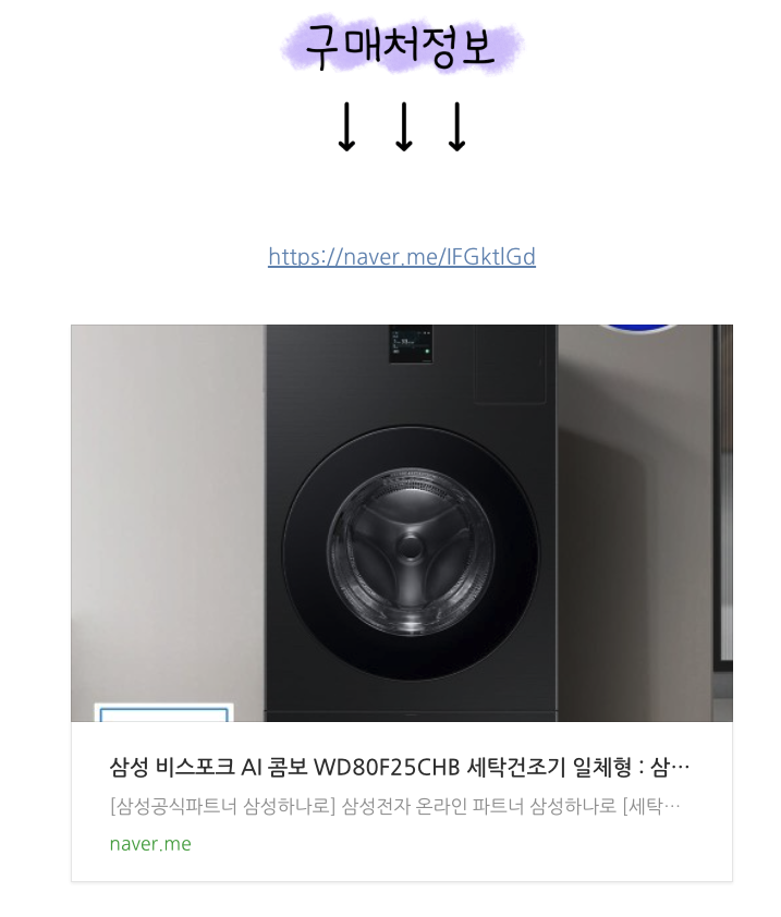 하지만 오늘 소개할 제품은 비용 부담을 확 줄이면서도 ‘한 번에 세탁과 건조를 끝내는’ 핵심 기능은 그대로 담은 실속형 모델, 삼성 비스포크 AI 콤보 WD80F25CHB (블랙 캐비어) 입니다.