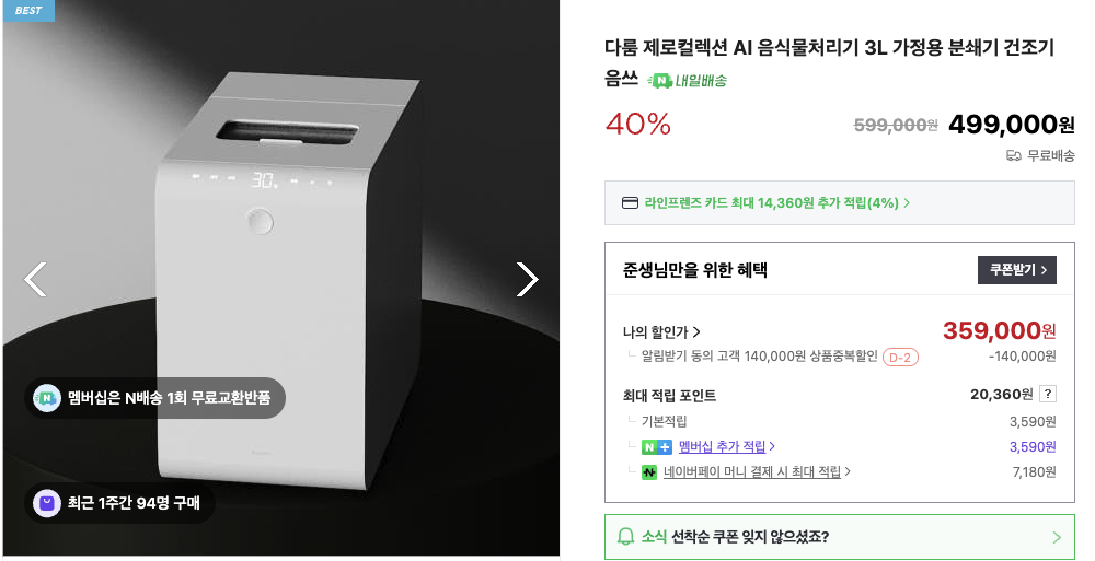 저희 집은 3인 가구(부부+9개월 아기)입니다. 이유식 컵, 남은 반찬, 과일 껍질 등 하루 배출량이 들쭉날쭉한데, 3L 용량+중간 투입+AI 모드 조합이 생활 리듬에 잘 맞았어요. 밤샘 처리 후 아침에 깔끔하게 비워지는 루틴이 생기니, 주방 냄새 관리가 쉬워지고, 배수구 청소도 덜 하게 됐습니다.