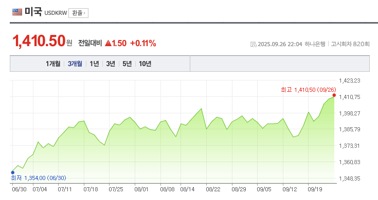 현재 원달러 환율은 1,410원 전후를 오가고 있습니다. 중장기 전망에 대해서는 전문가마다 다르지만 대체로 1,435~1,445원 구간 안착 가능성을 이야기하고 있고, 일부는 1,500원까지도 거론합니다. 물론 이는 단정할 수 없는 전망이지만, 글로벌 경기 흐름과 미국 연준(Fed)의 금리 정책, 그리고 한·미 투자 협상 상황에 따라 충분히 현실화될 수 있는 시나리오예요.