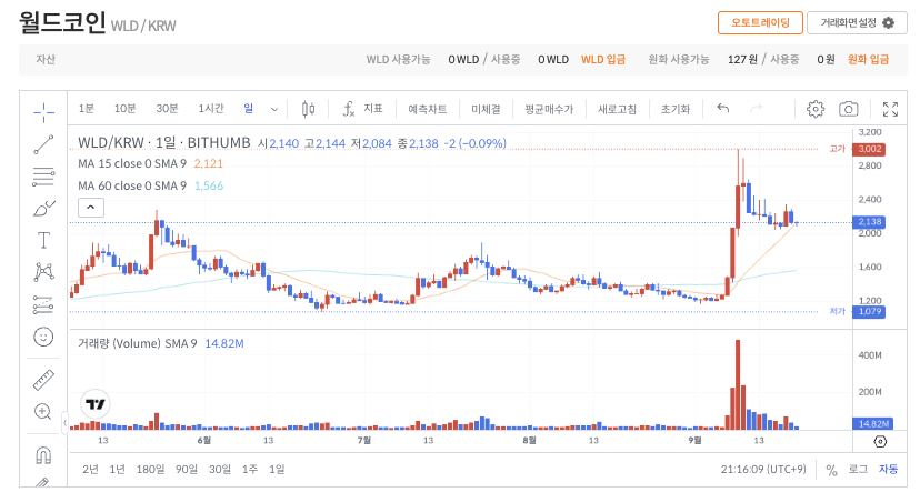 상장 직후 월드코인은 예상대로 큰 변동성을 보였습니다. 초기 급락이 있었지만 이는 신규 상장에서 흔히 나타나는 차익 실현 매물 때문으로 보입니다. 이후 2,600원~2,800원 구간에서 단기 박스권을 형성하며 안정세를 찾고 있어요.