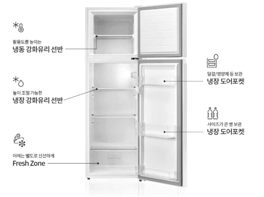 주요 기능빅사이즈 도어 포켓, Fresh Zone, 높이 조절 강화유리 선반, LED 조명
