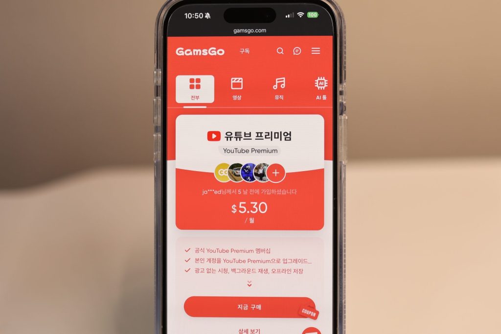먼저 위 겜스고 공식 홈페이지로 접속해서 회원가입을 진행한 뒤, [유튜브 프리미엄]을 하단의 [지금 구매]를 누릅니다.