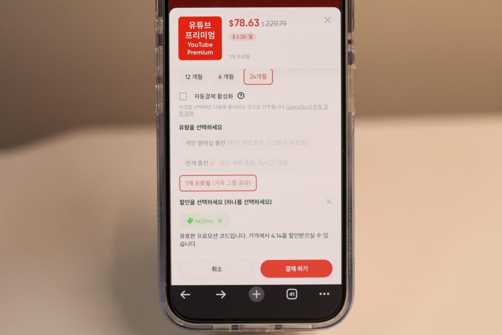 6개월 or 12개월 or 24개월 상품을 선택하고, 1개 프로필 (가족 그룹 공유) 버튼을 눌러주세요. 그리고 하단에 프로모션 코드에 ‘nc5mv’를 입력하면 추가로 5%가량 할인을 받을 수 있습니다. 24개월인 경우 6천원가량 할인받을 수 있으니 꼭 잊지말고 입력한 뒤 결제하기로 갑니다.