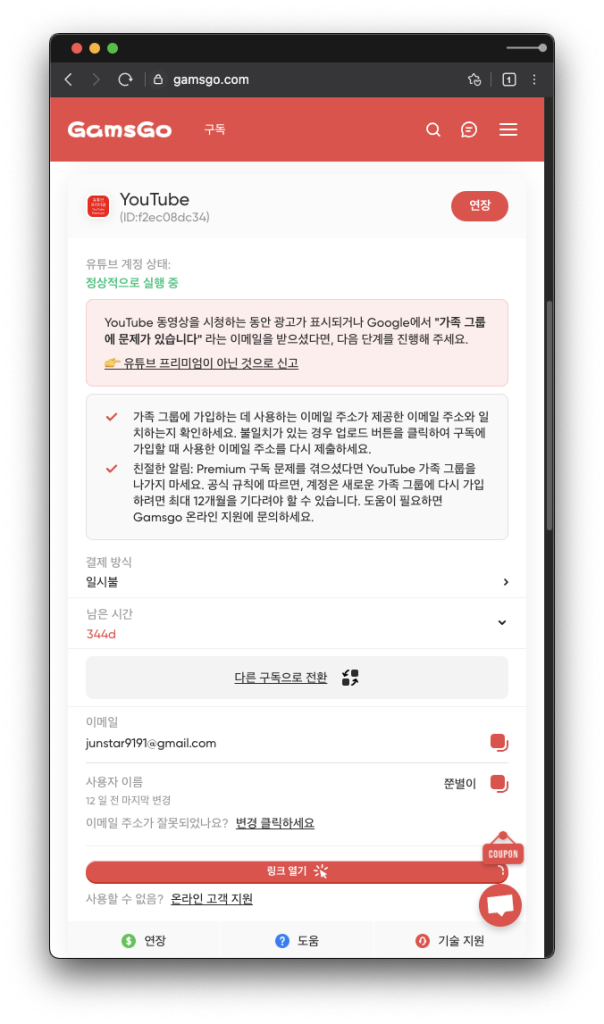 게다가 가족공유는 구독 후 ‘즉시’ 프리미엄이 활성화되는 반면, 개인 충전의 경우 가입정보 입력 후에 겜스고 직원이 대리결제를 해줄 때까지 1-2일정도는 기다려야해요. (참고 : 개인충전 방법 포스팅)