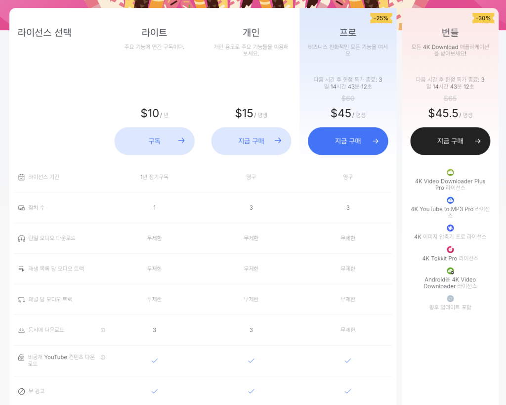 4Kdownload는 유튜브 같은 사이트에서 영상이나 음원을 내려받을 수 있게 해주는 여러가지 프로그램들이 모여 있는 서비스에요. 무료 서비스도 있지만 유료 서비스도 존재합니다. 그중에서 우리가 사용할 건 ‘4K YouTube to MP3’라는 데스크톱 프로그램입니다.