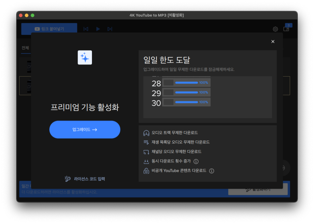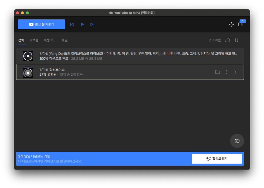 이 프로그램을 다운받고 유튜브 주소를 복사하면 영상 부분은 빼고 소리만 MP3로 뽑아줍니다. 덕분에 음악이나 강연, 팟캐스트처럼 듣기용 컨텐츠를 저장해두기 좋습니다. 하루 최대 5개의 MP3 추출까지 무료로 쓸 수 있어요.