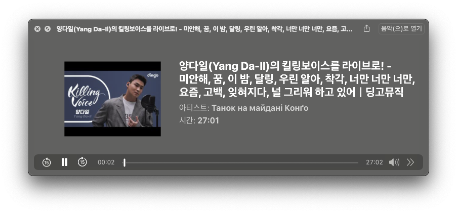 실행해보니 정상적으로 MP3 파일이 실행되는 것을 볼 수 있어요. 27분짜리 mp3 파일도 1개의 파일로 쳐줍니다. 대박이죠?