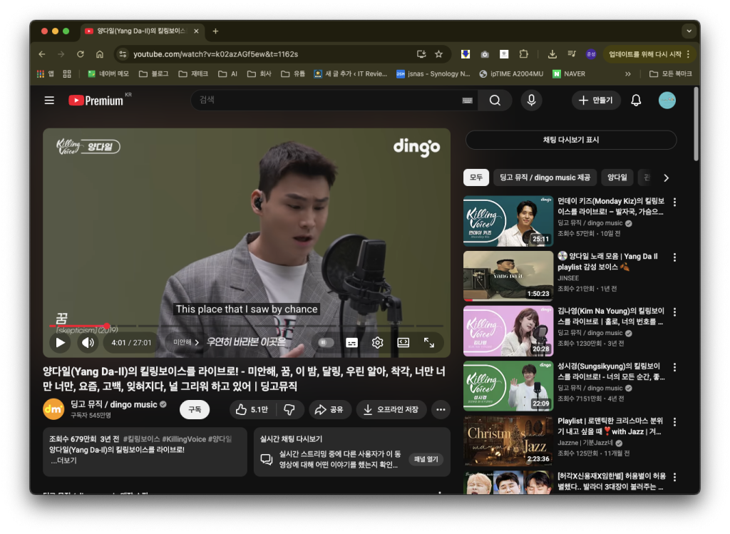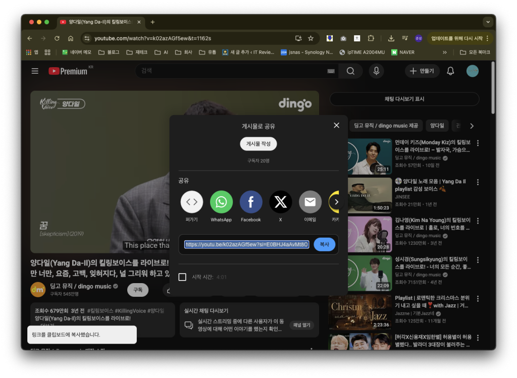 먼저 브라우저에서 원하는 유튜브 영상을 엽니다. 저는 양다일님의 킬링보이스 영상을 받고싶어서 들어갔어요. 이후 상단 주소창에 있는 긴 링크를 전체 선택해서 복사합니다.