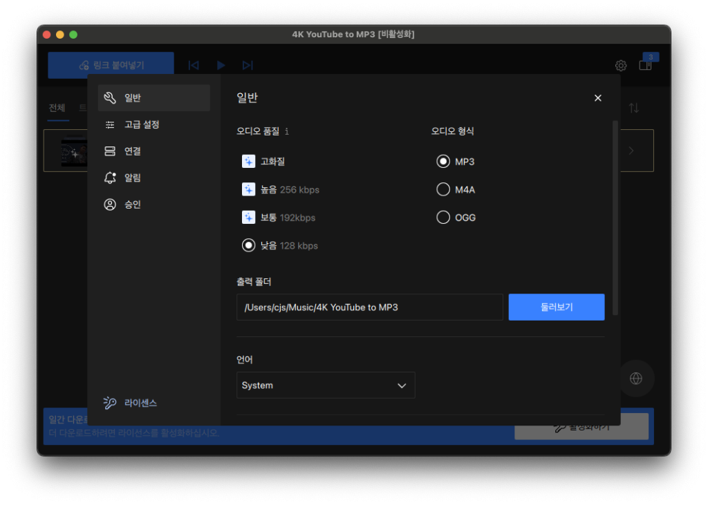 폴더 저장 위치는 한 번만 손봐두면 편합니다. 우측 상단의 설정 아이콘을 눌러보면, [일반] 탭에서 오디오 포맷과 품질을 선택하는 항목이 있어요. 보통 기본값만 써도 무난하지만 저장 폴더를 바꿀 수도 있습니다. 한 번만 설정해두면 이후 다운로드는 모두 같은 폴더에 다운로드되기 때문에 나중에 플레이어에서 불러오기에도 수월해요.