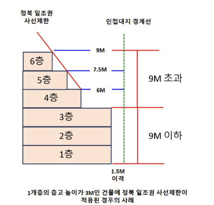 현재 건축법은 주거지역에서 건물을 지을 때, 햇빛이 가려지지 않도록 건물의 높이에 따라 대지 경계선과 일정 거리를 확보하도록 규정하고 있습니다. 쉽게 말해, 건물이 높아질수록 옆 건물에 햇빛을 가리지 않게 뒤로 물러서서 짓도록 한 규제예요.