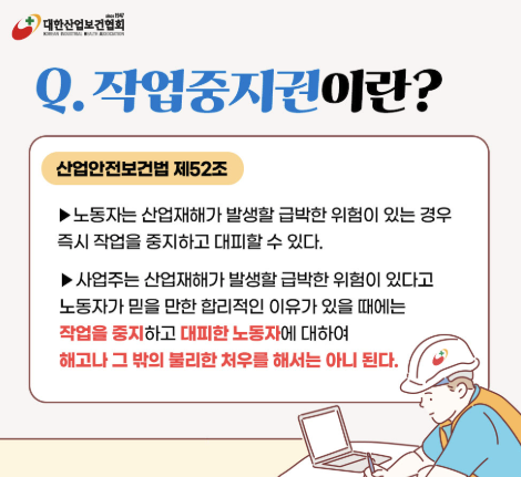 | 급박한 위험 시 즉시 작업을 중단하고 대피할 수 있음 | 작업중지 후 지체 없이 관리감독자에게 보고해야 함 |