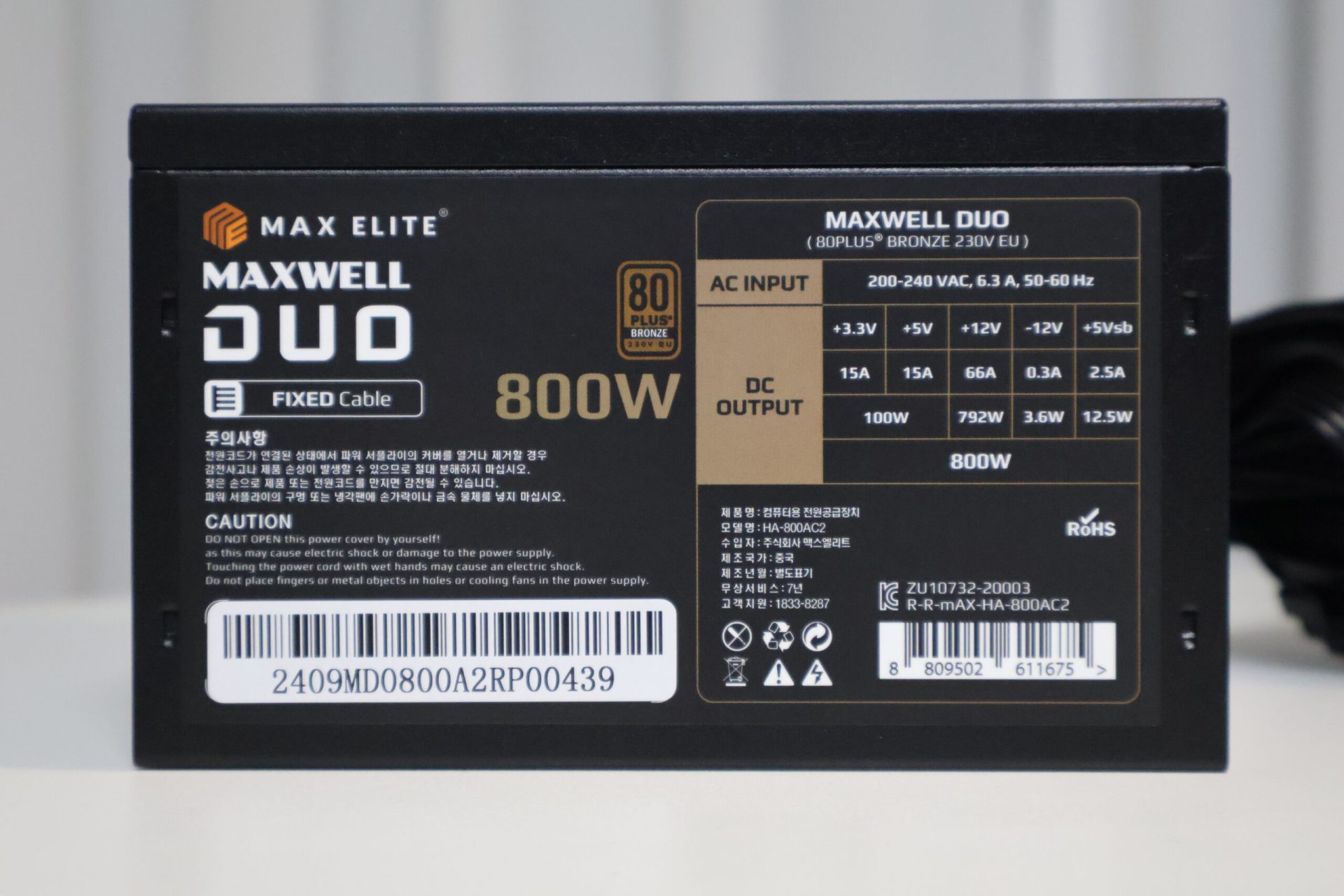 맥스엘리트 MAXWELL DUO 800W는 저소음, 고성능, 안정성, 긴 보증 기간까지 갖춘 파워서플라이로, 고사양 PC 유저들에게 강력히 추천할 만한 제품입니다.
