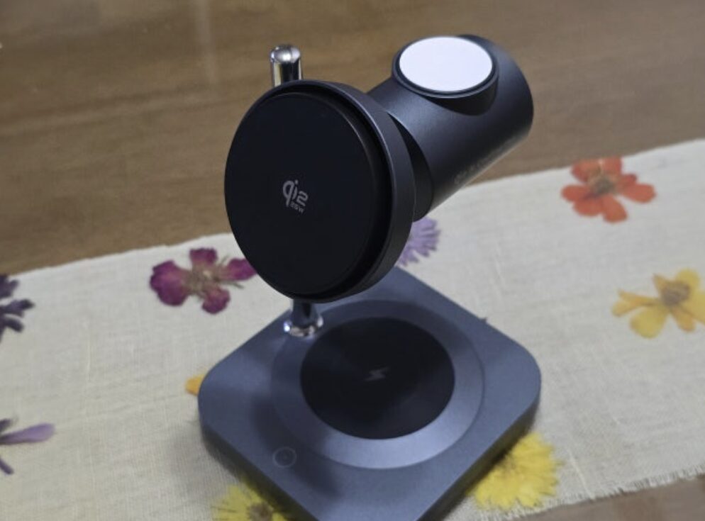 책상 위에 널브러진 케이블들 때문에 스트레스받았던 분들이라면 이 제품이 정답이에요. 스마트폰, 스마트워치, 이어폰까지 3가지 기기를 한 번에 충전할 수 있는 3in1 솔루션이기 때문입니다. 특히 스마트워치 충전 패드가 애플워치와 갤럭시워치를 모두 지원하는 통합형이라서 정말 편했어요. 집에 애플 제품과 삼성 제품이 섞여 있어도 이 스탠드 하나면 해결되니까요. N52 등급의 강력한 자석이 스마트폰을 착 하고 고정해 주니 위치를 맞추느라 고생할 필요도 없어서 편리했습니다.
