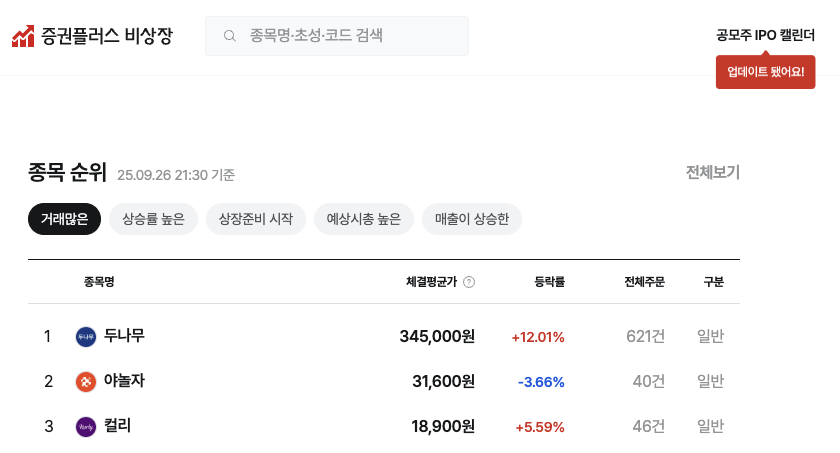 증권플러스 비상장 주요 지표