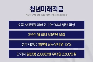 | 우대형 | 12% | 중소기업 신규 취업 청년 대상, 매달 50만 원 납입 시 6만 원 추가 지원 |