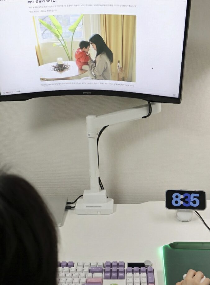 덕분에 32인치 커브드 모니터를 제 눈높이보다 훨씬 높게, 마치 공중에 떠 있는 것처럼 세팅할 수 있었습니다. 의자 목받침대에 기댄 상태로도 모니터 화면이 정중앙에 들어오도록 세팅하니, 3시간 이상 연속 고강도 작업에도 목의 피로가 확연히 줄어들더라고요.