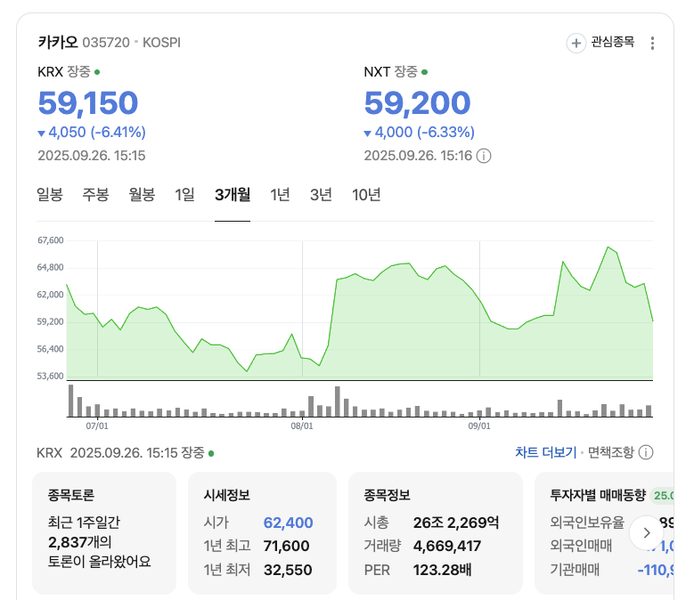 최근 정규장에서 카카오 주가는 62,500원까지 내려갔고, 애프터마켓에서는 60,900원까지 떨어졌습니다. 외국인과 기관의 순매수 덕분에 한 달간 10% 가까이 상승세를 이어오던 흐름이 재판 이슈로 꺾인 상황이에요.