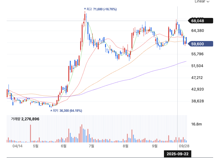 차트 관점에서 보면, 일봉·주봉은 단기 상승 흐름을 만들고 있지만, 월봉에서는 여전히 강한 저항 구간이 존재합니다. 즉, 단기적으로는 반등의 기회가 있을 수 있으나 7만 원 이상을 다시 돌파하기에는 힘이 부친 상황으로 해석됩니다.