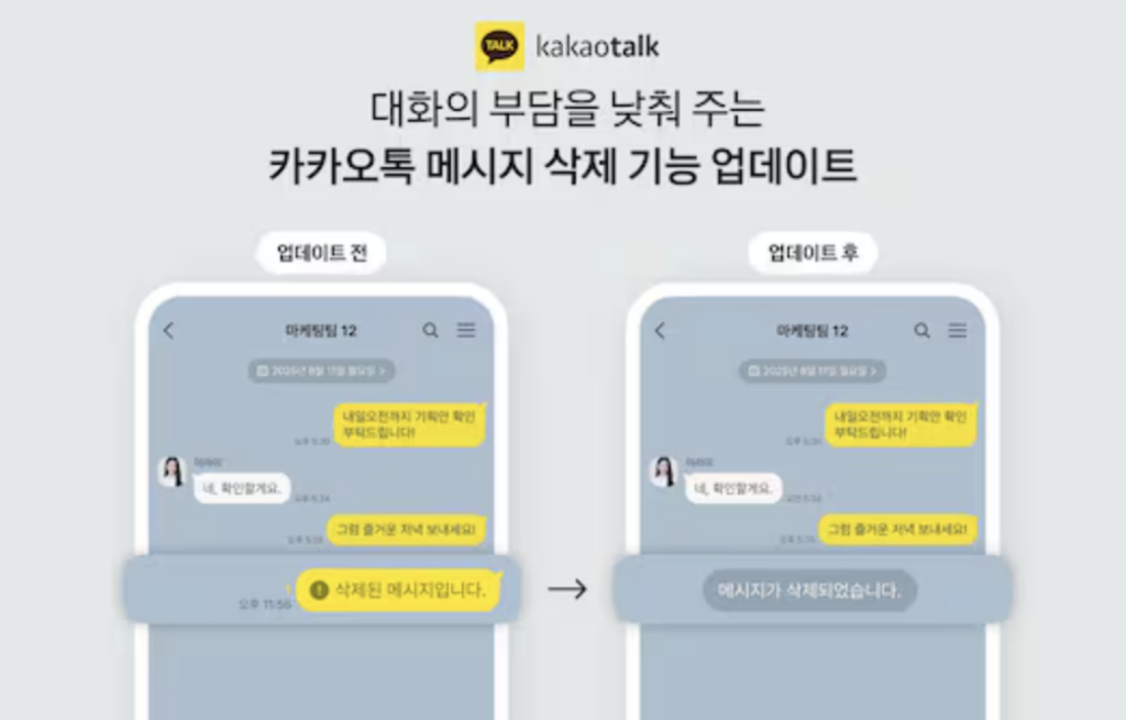 예전에는 누가 메시지를 삭제했는지 쉽게 알 수 있었습니다. 삭제된 메시지 옆에 발신자의 말풍선이 그대로 남아 있었기 때문이에요. 하지만 이제는 ‘메시지가 삭제되었습니다’라는 표시만 남고, 누가 지웠는지는 특정되지 않습니다. 특히 단체방에서는 발신자가 전혀 드러나지 않아 심리적 부담이 크게 줄었어요. 다만 개인 대화방에서는 여전히 상대가 삭제 사실을 인지할 수 있다는 점은 참고해야 합니다.