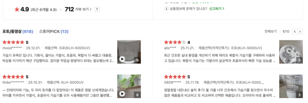 가습기 물통은 호흡기로 들어가는 물을 저장하는 부위라 소재가 매우 중요합니다. KLH-5000UV는 SK케미칼 PETG와 LG화학 ABS를 사용해 안정성을 확보했습니다. 환경호르몬 걱정 없이 사용할 수 있어 아이 있는 집에 특히 적합합니다.