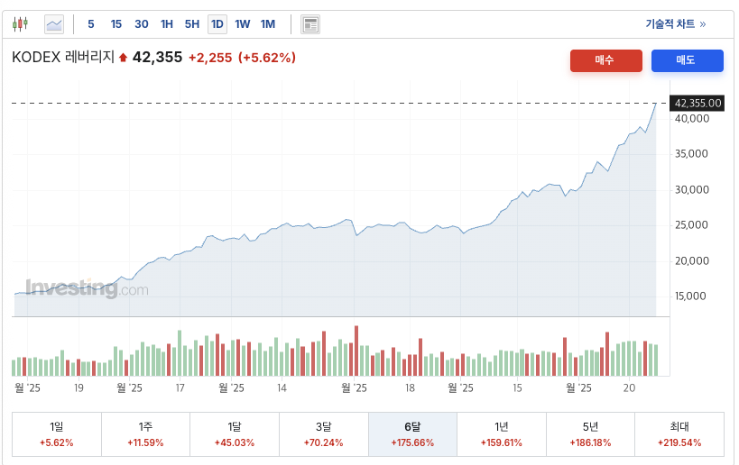 최근 이 ETF로 자금이 몰리는 강도는 과거 개별 테마주 급등기 못지않아요. KODEX 레버리지는 10월 말 기준으로 하루 거래대금이 1조 원을 넘겼고 거래량은 2,600만 주 이상이었습니다. 최근 1개월 수익률은 약 +45% 수준, 3개월은 +70% 이상, 1년은 +186%대까지 찍혀 있어요. 이런 숫자는 일반적인 우량주로는 거의 보기 힘든 구간이에요. 투자자 입장에서는 “시장 전체에 타서도 이 정도가 나와?”라는 욕구를 자극합니다.