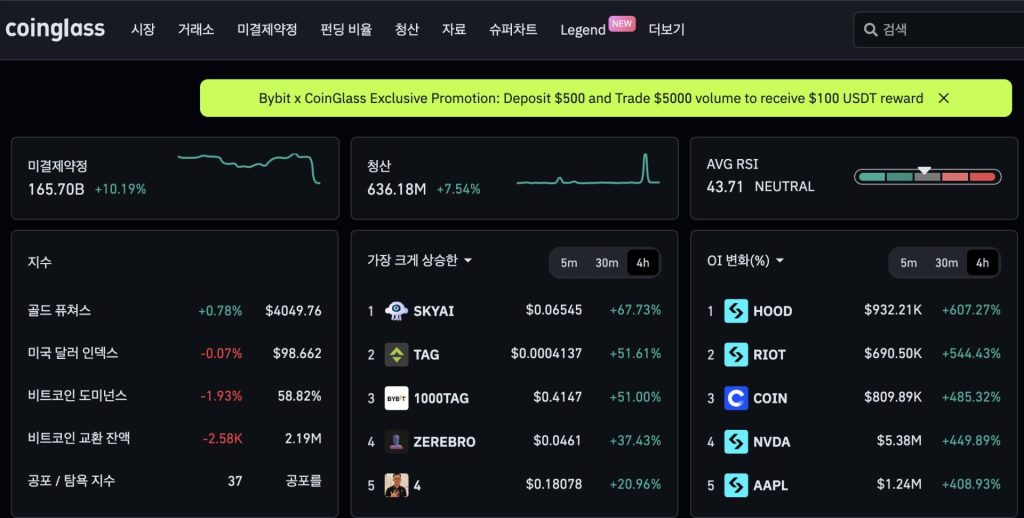갑자기 급등하거나 폭락할 때마다 ‘지금 들어가도 될까?’라는 조급함이 올라오죠. 차트만 보면 늘 한 발 늦어요. 그래서 저는 요즘 가격 옆에서 꼭 함께 확인하는 보조 화면이 있어요. 바로 코인글래스입니다. 미결제약정, 펀딩비, 청산맵 같은 선물 전용 데이터가 한 눈에 보이기 때문에, 방향을 찍는 게 아니라 “지금 시장에 어떤 힘이 작용 중인지”를 이해할 수 있어요.