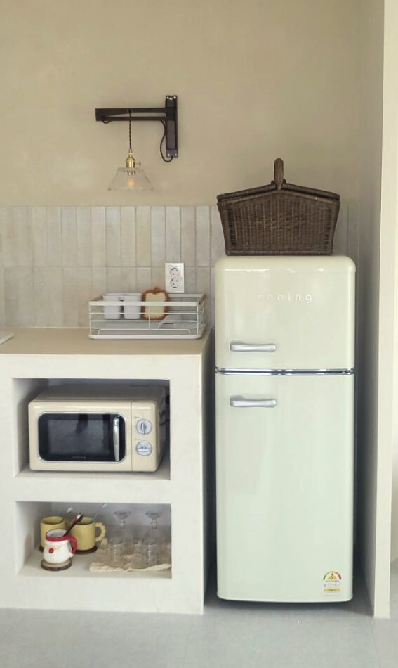 이 제품을 선택하게 된 가장 큰 이유는 단연 디자인 때문이었어요. 가전제품이 단순히 기능을 넘어 인테리어의 일부가 되는 요즘 트렌드에 딱 맞는 제품이라는 생각이 들었거든요. 투박한 일반 냉장고와 달리 부드러운 곡선 처리가 된 바디라인과 레트로한 감성의 크롬 소재 핸들이 공간의 분위기를 확 바꿔주었어요. 저는 크림 컬러를 선택했는데, 튀지 않으면서도 은은하게 방 안의 가구들과 조화를 이루는 점이 마음에 들었어요.