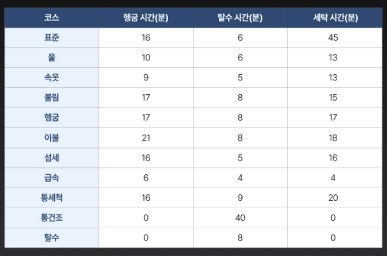 이 제품의 가장 큰 특징은 소형 세탁기임에도 불구하고 11가지나 되는 맞춤 세탁 코스를 지원한다는 점이에요. 표준 코스부터 울, 속옷, 이불, 급속 세탁까지 상황에 맞춰 버튼 하나로 조절할 수 있어서 정말 편리했어요. 왜냐하면 세탁물 소재에 따라 세척 강도를 조절해야 옷감 손상을 줄일 수 있기 때문입니다. 특히 수건이나 속옷처럼 자주 세탁해야 하는 소량 빨래는 급속 코스를 활용하면 시간을 대폭 아낄 수 있어서 좋았어요.