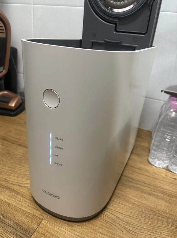 매일 쓰는 가전인 만큼 세척이 편해야 하는데 원터치 자동 세척 기능이 있어 관리가 무척 쉬웠어요. 건조통에 물을 붓고 버튼만 누르면 내부까지 알아서 씻어주니 손에 음식물을 묻힐 필요가 없어서 좋았어요. 또한 내부 뚜껑이나 물받이, 필터 커버가 모두 분리되는 구조라 위생적으로 관리할 수 있었습니다. 다만 한 가지 아쉬운 점을 꼽자면 2L 용량이라 4인 가족이 한꺼번에 많은 양의 수박 껍질 같은 걸 처리하기엔 조금 작게 느껴질 수 있다는 점이에요. 그래도 그때그때 바로 처리하는 습관을 들이면 큰 불편함은 아니었어요.