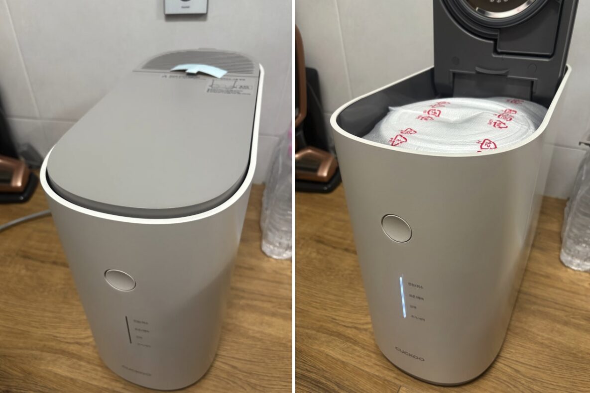 매일 쓰는 가전인 만큼 세척이 편해야 하는데 원터치 자동 세척 기능이 있어 관리가 무척 쉬웠어요. 건조통에 물을 붓고 버튼만 누르면 내부까지 알아서 씻어주니 손에 음식물을 묻힐 필요가 없어서 좋았어요. 또한 내부 뚜껑이나 물받이, 필터 커버가 모두 분리되는 구조라 위생적으로 관리할 수 있었습니다. 다만 한 가지 아쉬운 점을 꼽자면 2L 용량이라 4인 가족이 한꺼번에 많은 양의 수박 껍질 같은 걸 처리하기엔 조금 작게 느껴질 수 있다는 점이에요. 그래도 그때그때 바로 처리하는 습관을 들이면 큰 불편함은 아니었어요.