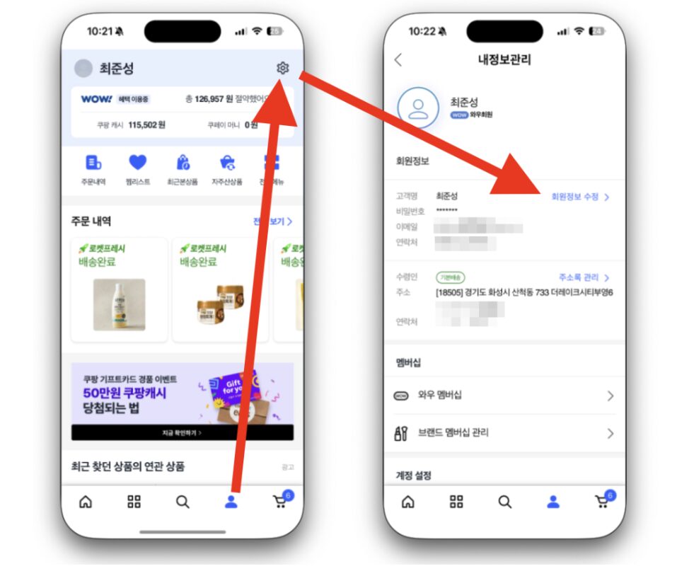 쿠팡 앱에 접속한 뒤, 하단 메뉴에서 [사람 아이콘 > 설정 > 회원정보 수정]을 눌러 들어갑니다.