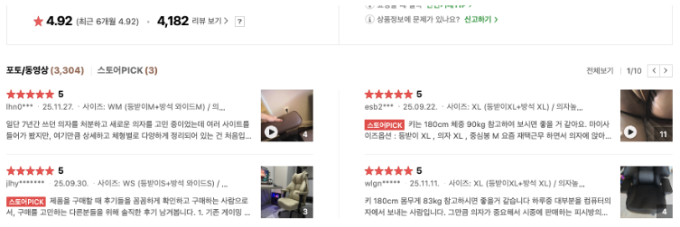사이즈와 옵션이 너무 다양하다 보니(총 45가지 조합), 처음에 뭘 사야 할지 고민이 많이 됩니다. 단순히 ‘중형’을 사는 게 아니라 내 키와 체형을 정확히 알고 골라야 실패가 없습니다. 다행히 상세페이지에 키와 몸무게별 추천 가이드가 아주 자세히 나와 있으니, 구매 전 꼼꼼히 확인하고 그래도 헷갈린다면 톡톡 문의를 활용하는 게 좋습니다.