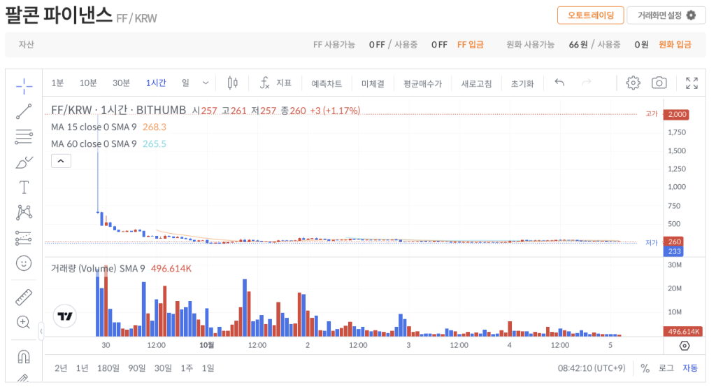 팔콘 파이낸스는 업비트를 비롯해 바이낸스, 빗썸 등 여러 거래소에 동시 상장되었습니다. 상장 초기에는 예상대로 급등 후 급락이라는 전형적인 패턴이 나타났어요. 오픈 직후 거래량이 급증하며 단기 상승세를 보였지만, 차익 실현 매물이 쏟아지며 조정 국면에 들어선 것이죠.