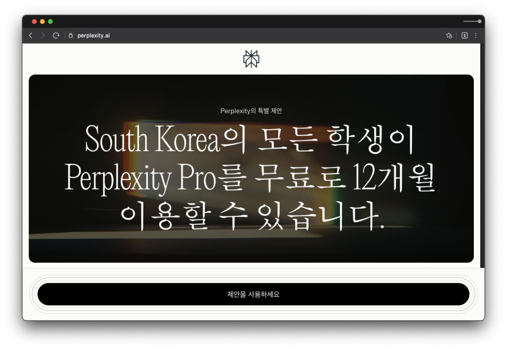 | 1단계 | Perplexity 공식 학생 페이지에 접속해 ‘제안을 사용하세요’ 버튼을 클릭합니다. |