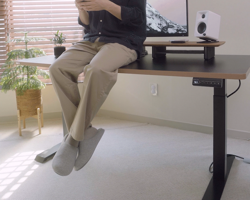 모션데스크의 심장인 모터 성능 또한 압도적이었습니다. 저가형 싱글 모터가 아니라 ‘듀얼 모터’를 탑재해서 힘이 좋고 움직임이 훨씬 부드럽습니다. 최대 100kg의 하중까지 견딜 수 있다고 하니, 무거운 데스크탑 본체와 듀얼 모니터를 올려둬도 전혀 무리가 없었습니다.