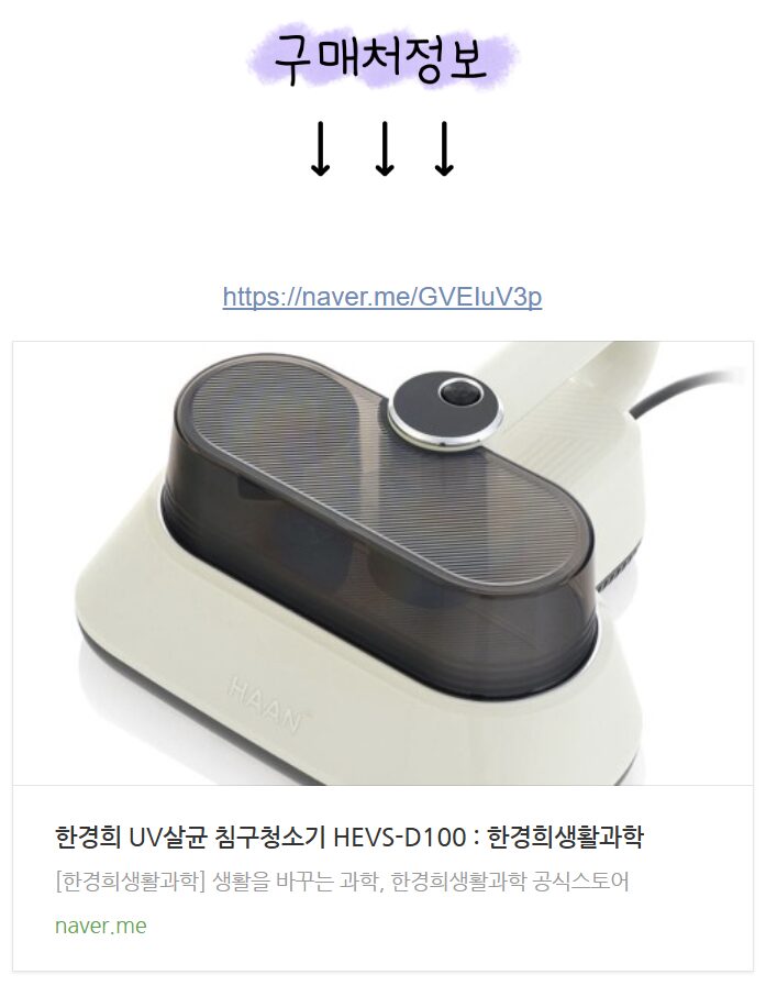 고민 끝에 침대를 옥상에 널어 햇볕에 말릴 수 없는 환경이라, 확실한 대안을 찾기 시작했습니다. 여러 제품을 꼼꼼히 비교해 본 끝에, 강력한 흡입력과 살균 기능을 갖춘 한경희 UV살균 침구청소기(HEVS-D100)를 내돈내산으로 구매하게 되었습니다.