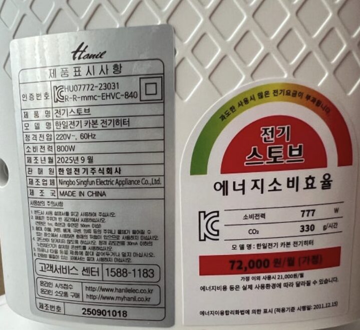 | 브랜드/모델명 | 한일전기 / 카본 전기히터 (EHVC-840) |