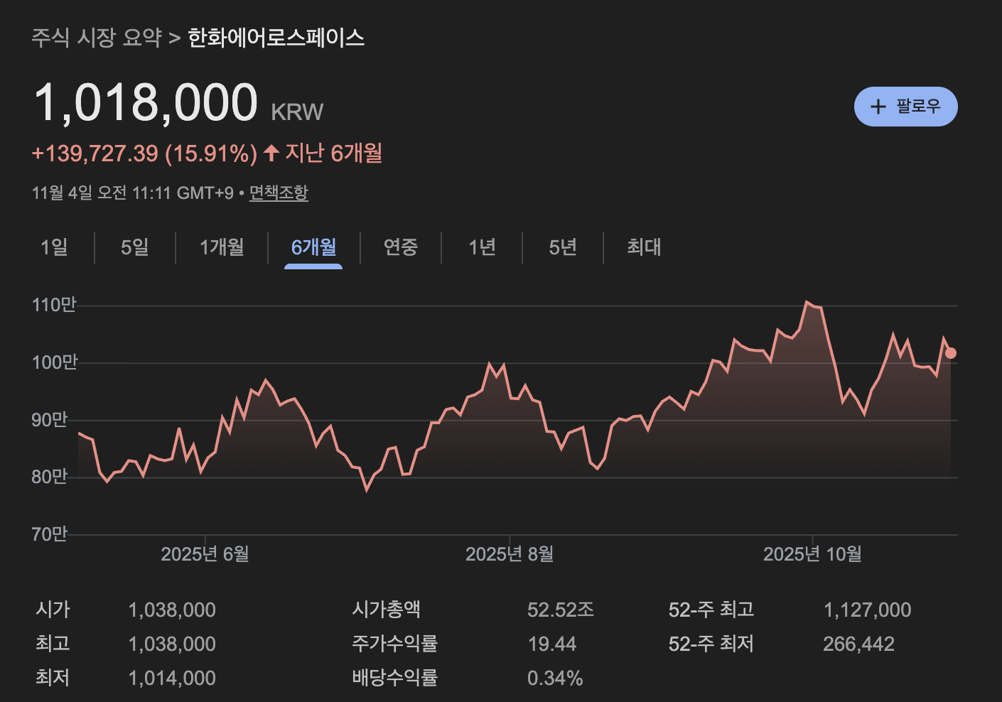 한화에어로스페이스 주가는 어느새 100만원을 넘어섰어요. 몇 년 사이 10배 가까이 오른 종목이라 “이제는 너무 늦은 거 아닌가요?”라는 말이 자연스럽게 나옵니다. 하지만 숫자를 차근차근 뜯어보면, 단순한 테마주가 아니라 실적과 수주가 받쳐주는 구조적 성장 스토리라는 점이 드러납니다.
