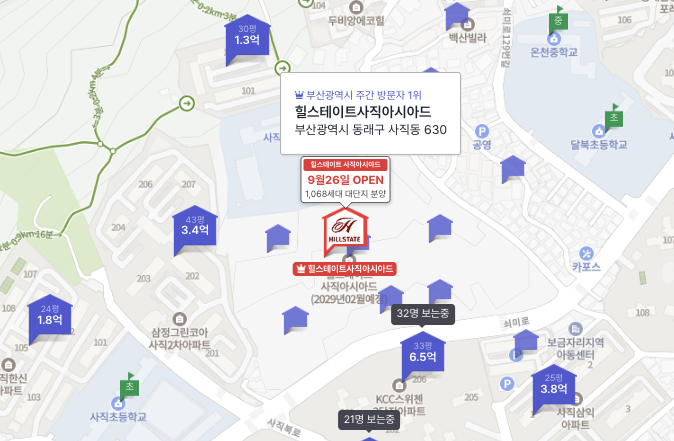 입지는 ‘사직’이라는 이름만으로도 설명이 가능할 정도입니다. 반경 2km 내에 롯데마트, 이마트 동래점, 홈플러스 아시아드점, 사직시장 등 생활 인프라가 풍부합니다. 문화·여가 시설로는 사직야구장, 부산종합운동장, CGV, 사직 먹자골목이 가까워요. 또한, 부산지방법원, 검찰청, 경찰서, 행정복지센터까지 위치해 생활 안정성이 뛰어납니다.