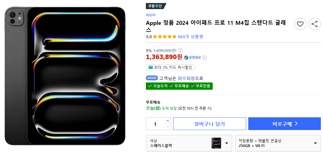 11/18일 기준의 쿠팡 아이패드 프로 M4 가격표입니다. 가격은 최저가에 따라 변동될 수 있으니 참고만해주세요!