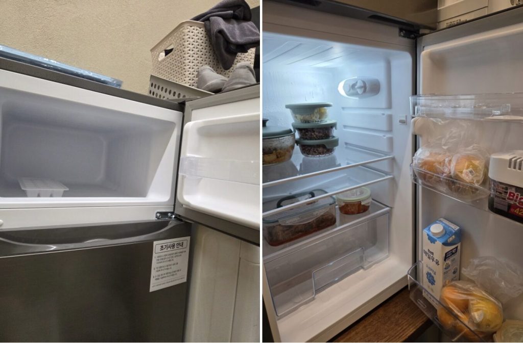 112L라는 용량이 작지 않을까 걱정했지만, 실제로는 공간 구성이 매우 알찼습니다. 가장 칭찬하고 싶은 점은 냉동실과 냉장실이 확실하게 분리된 2도어 구조라는 점이에요.
