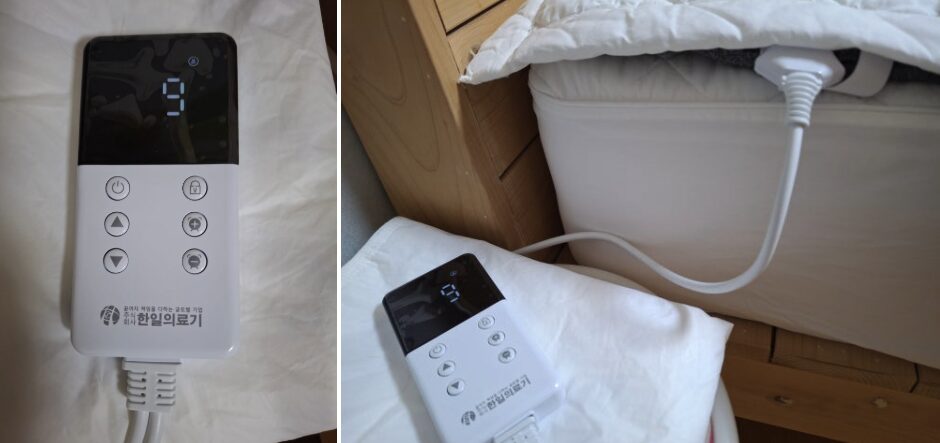 또한 8중 안전장치가 내장되어 있어 과부하나 과열 시 단계별로 전원을 차단해 준다고 해요. 온도 조절기도 디지털 방식으로 업그레이드되어서 선 길이가 1m 이상 길어졌고, 9단계로 미세하게 온도를 설정할 수 있어 수면 환경에 맞게 조절하기 편리했습니다.