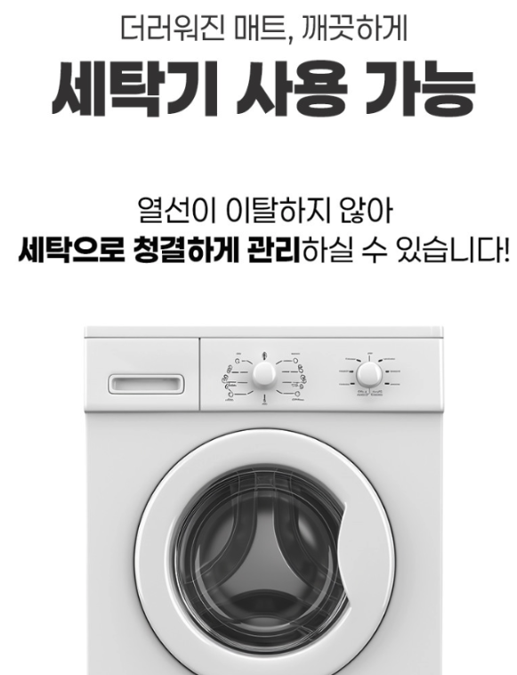 매트를 오래 쓰다 보면 땀이나 먼지 때문에 세탁하고 싶어질 때가 있잖아요. 한일의료기 프리즘은 세탁기 사용이 가능한 워셔블 제품이라 관리가 정말 편했어요. 일반 매트는 열선 이탈 우려 때문에 세탁이 불가능한 경우가 많은데, 이 제품은 초음파 퀼팅 공법으로 열선을 꽉 잡아주기 때문입니다.