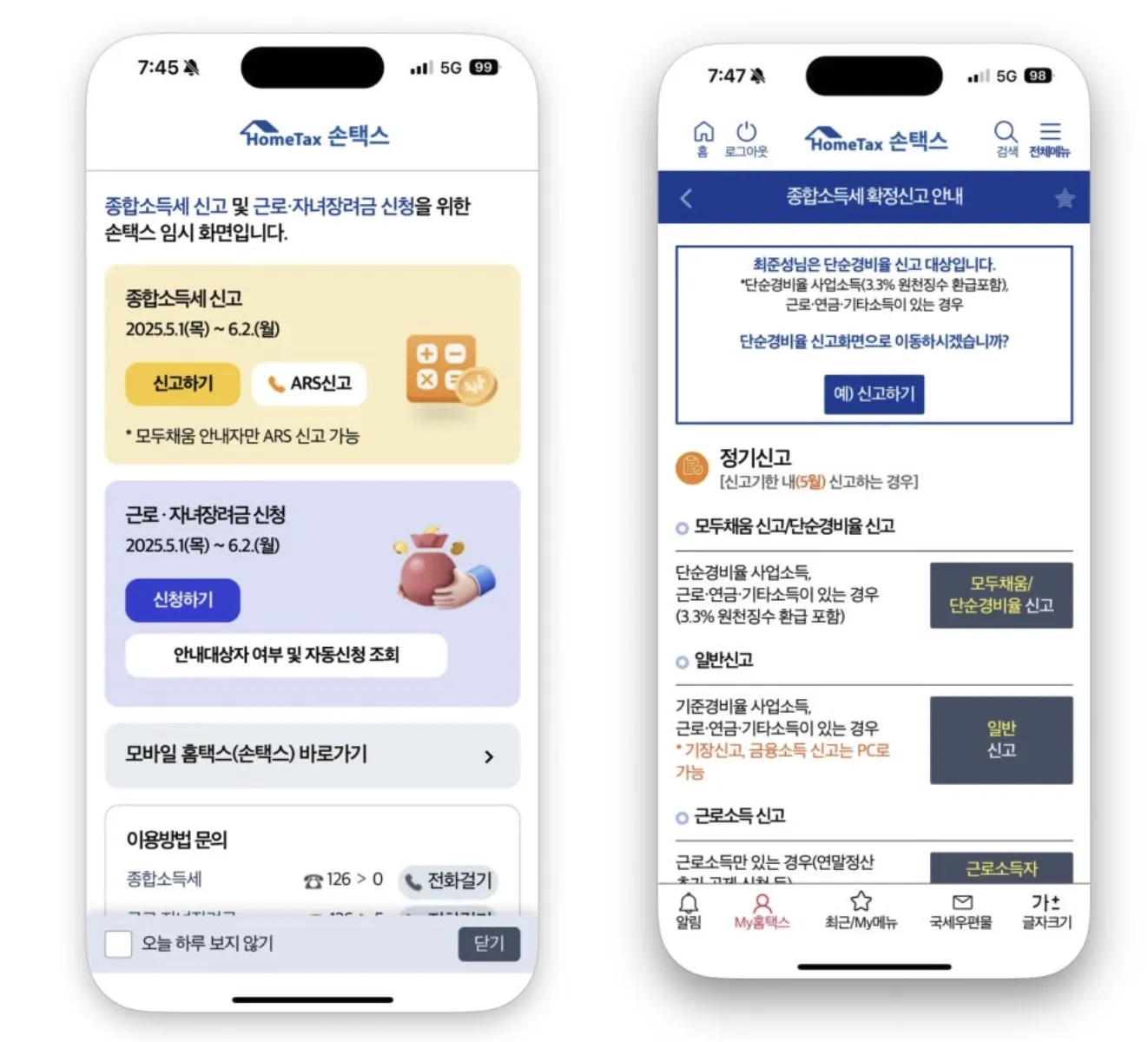 이에 따라 필자도 직접 홈택스 모바일 앱, 즉 손택스를 이용해 종합소득세 신고를 진행하였다. 이 글에서는 손택스 신고 과정을 순서대로 소개하고자 한다.