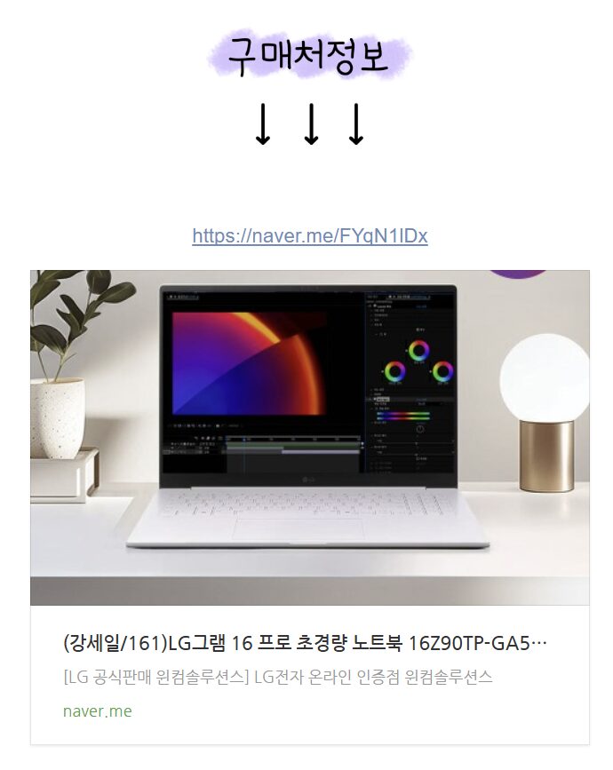 가벼우면 성능이 아쉽고, 성능이 좋으면 무겁더라고요. 그런데 결국 돈을 쓰면 해결되더라고요. 무게는 가볍지만 성능은 ‘프로’급인 노트북, 바로 LG 그램 프로 16Z90TP-GA5YK 모델을 구매했습니다.