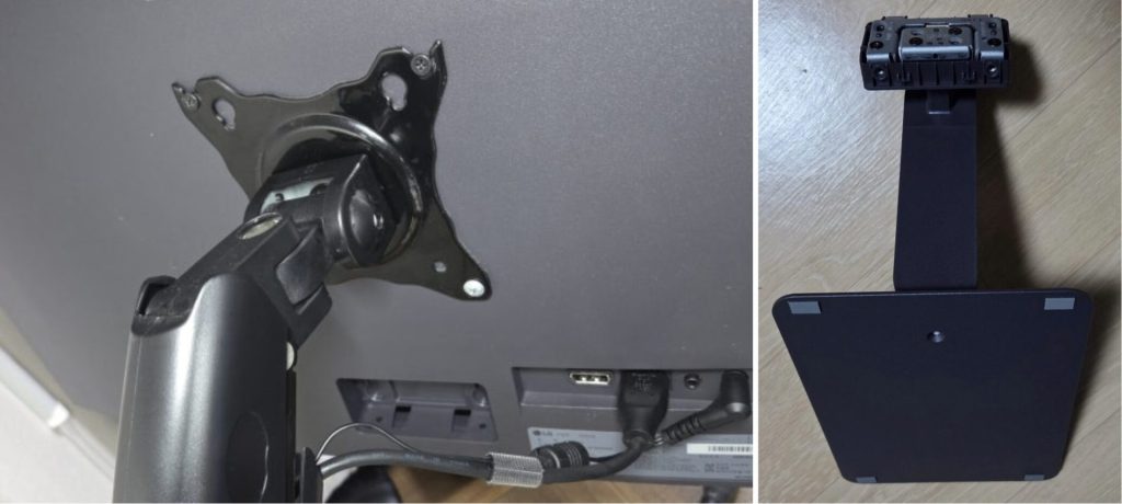 그리고 vesa 100×100 홀이 있어서 스탠드를 떼고 기존 사용하던 모니터암으로 교체할 수 있었어요.