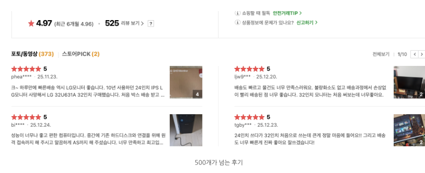 실제로 구매한 사람들의 평균 평점이 4.97점으로 30만원대 모니터 중에서는 완성도 측면에서 ‘탑’에 가까운 모니터라고 볼 수 있어요.